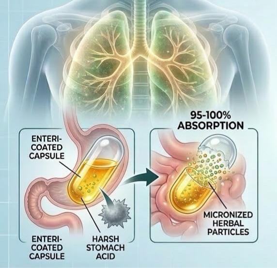 Herkömmliche Lungenpräparate scheitern oft daran, dass ihre Wirkstoffe durch die aggressive Magensäure zerstört werden, wodurch nur 20 % in Ihr System gelangen. LungRelief™ Kräuter-Lungen-Detox-Kapseln nutzen die revolutionäre magensaftresistente Mikronisierungs-Technologie. Diese stellt sicher, dass 95–100 % der pharmazeutischen pflanzlichen Verbindungen die Magensäure umgehen und direkt in den Blutkreislauf aufgenommen werden.
